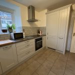 Single drainer, one and a half bowl, stainless steel, sink unit. Electric hob, oven and extractor. Integrated fridge and freezer. A range of wall and base units with worktops and splash back tiling.