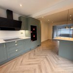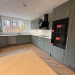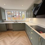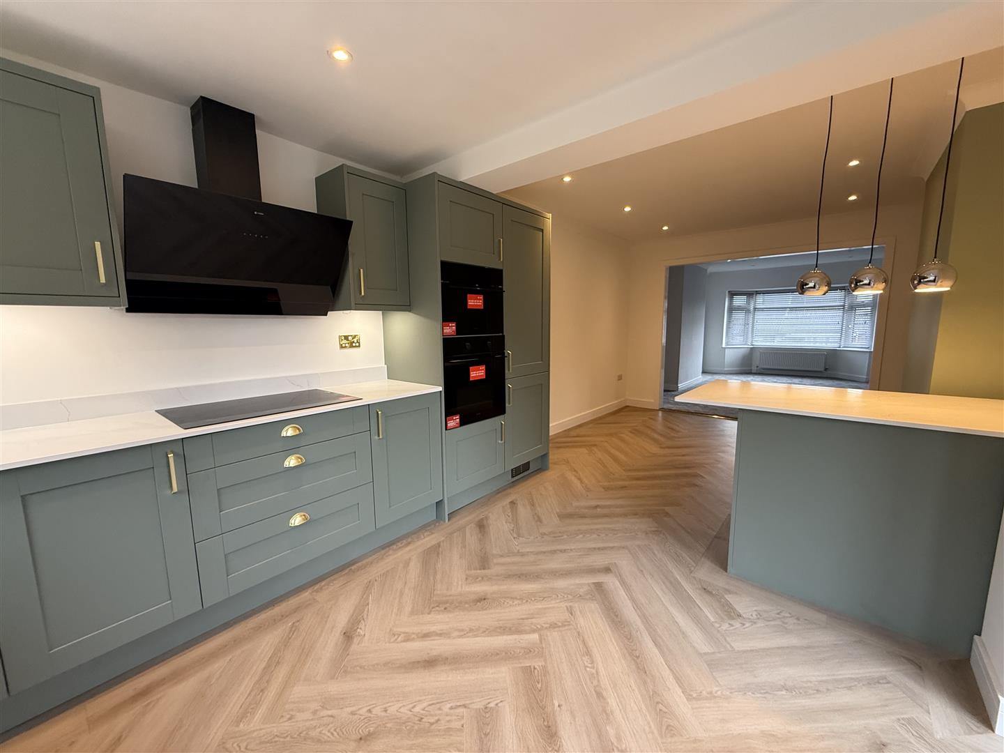 Single bowl, sink unit. Electric hob, oven, grill and extractor. Integrated fridge, freezer and dishwasher. A range of wall and base units with quartz worktops and splash back.