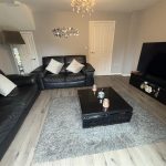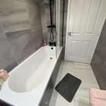 Three piece white suite, shower over the bath and shower screen, fully tiled.