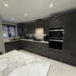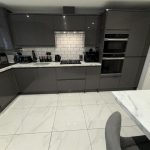 Single drainer, one and a half bowl, polycarbonate sink unit. Gas hob, oven, grill, fridge, freezer, washing machine and dishwasher. A range of wall and base units with worktops and breakfast bar.