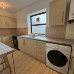 Single drainer, stainless steel, sink unit. A range of wall and base units with work tops and splash back tiling.