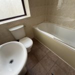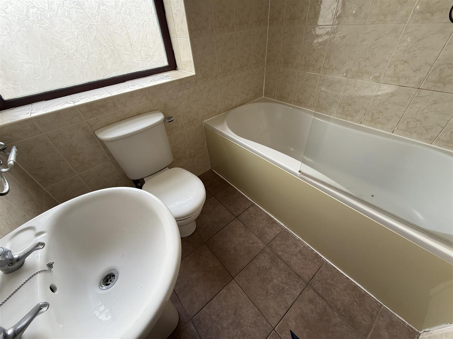 Three piece white suite, shower over the bath and shower screen, fully tiled walls.