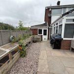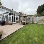 Front garden and driveway leading to the garage. The garage runs the length of the house and has a utility area at the rear. The rear garden is private with a patio area.