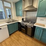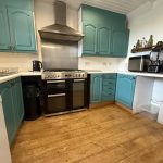 Single drainer, stainless steel, sink unit.Range cooker. Wall and base units with worktops and splash back tiling.