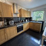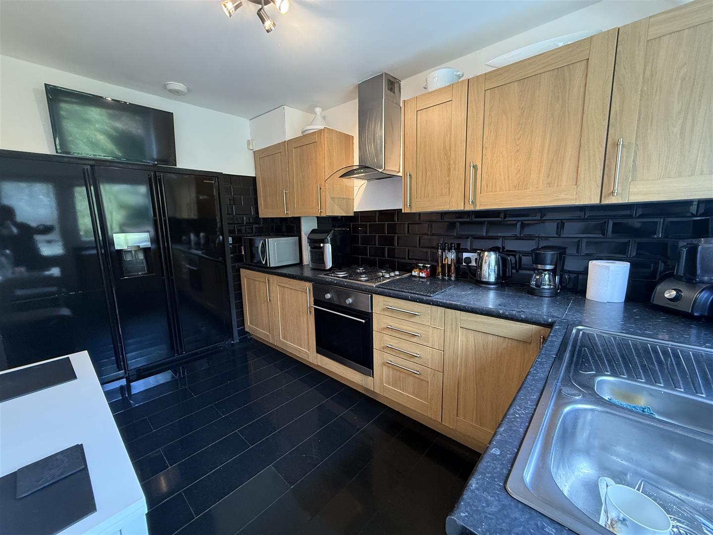 Single drainer, one and a half bowl, stainless steel, sink unit. Gas hob and electric oven. A range of wall and base units with worktops and splash back tiling.