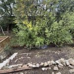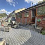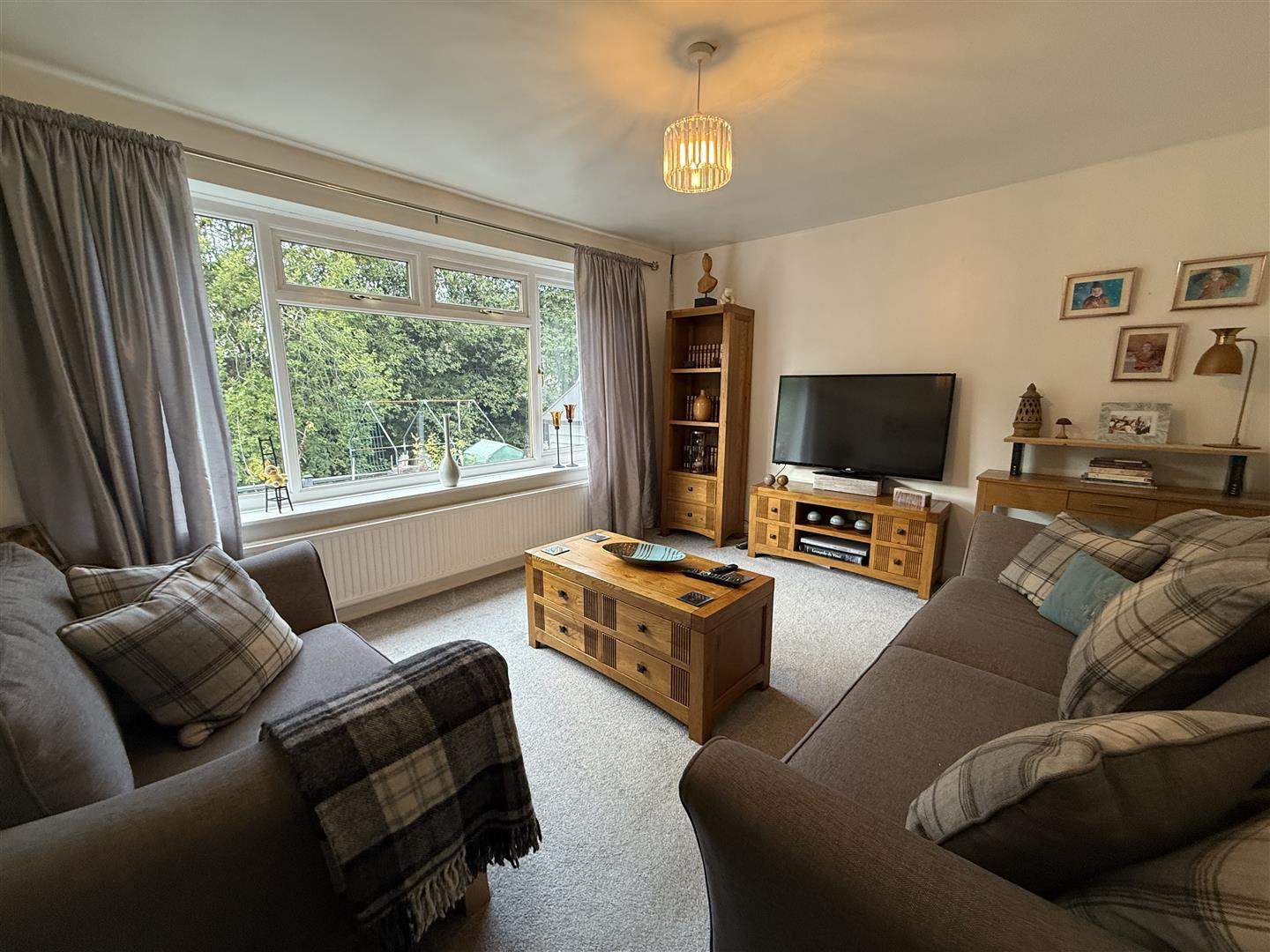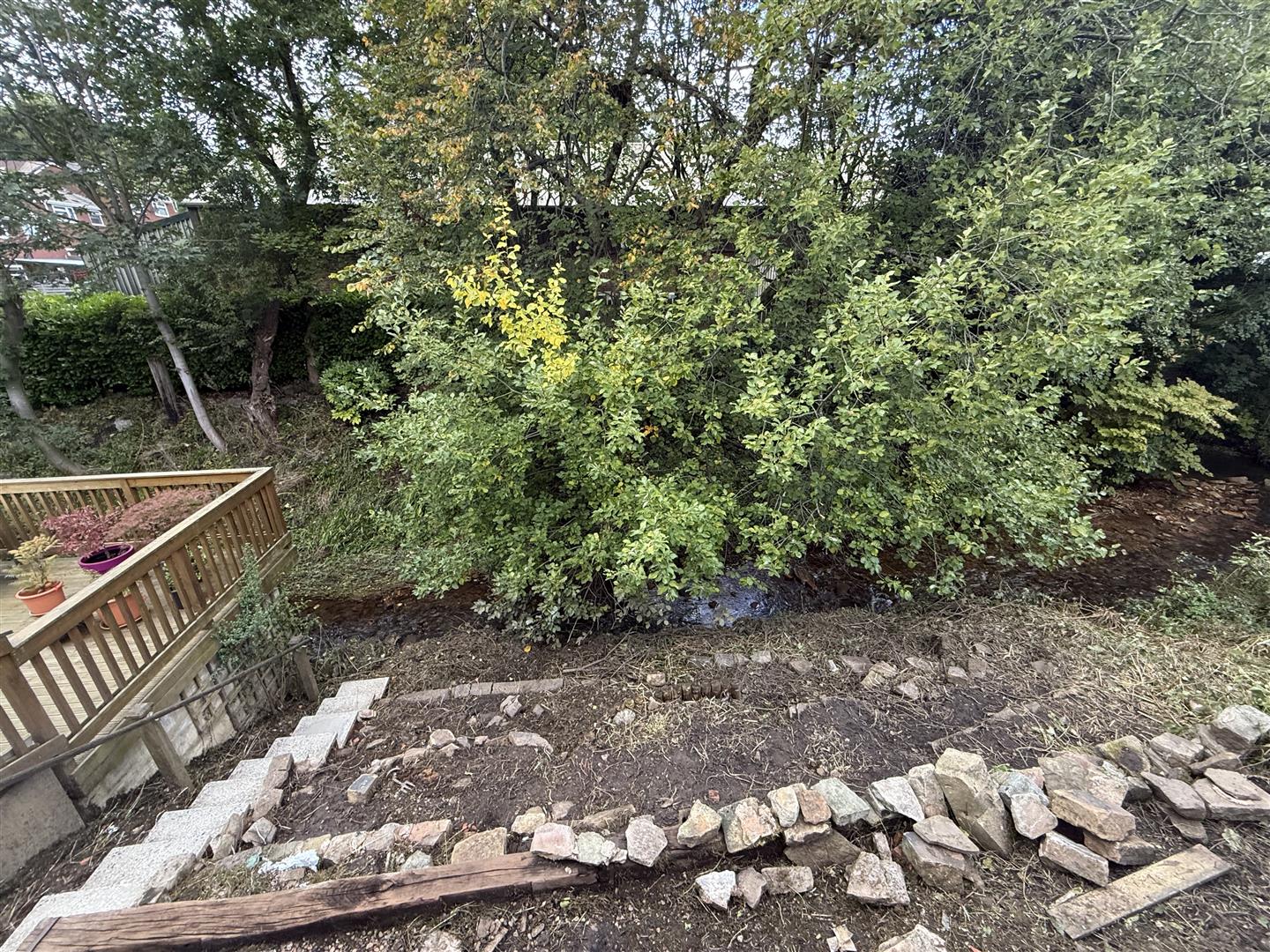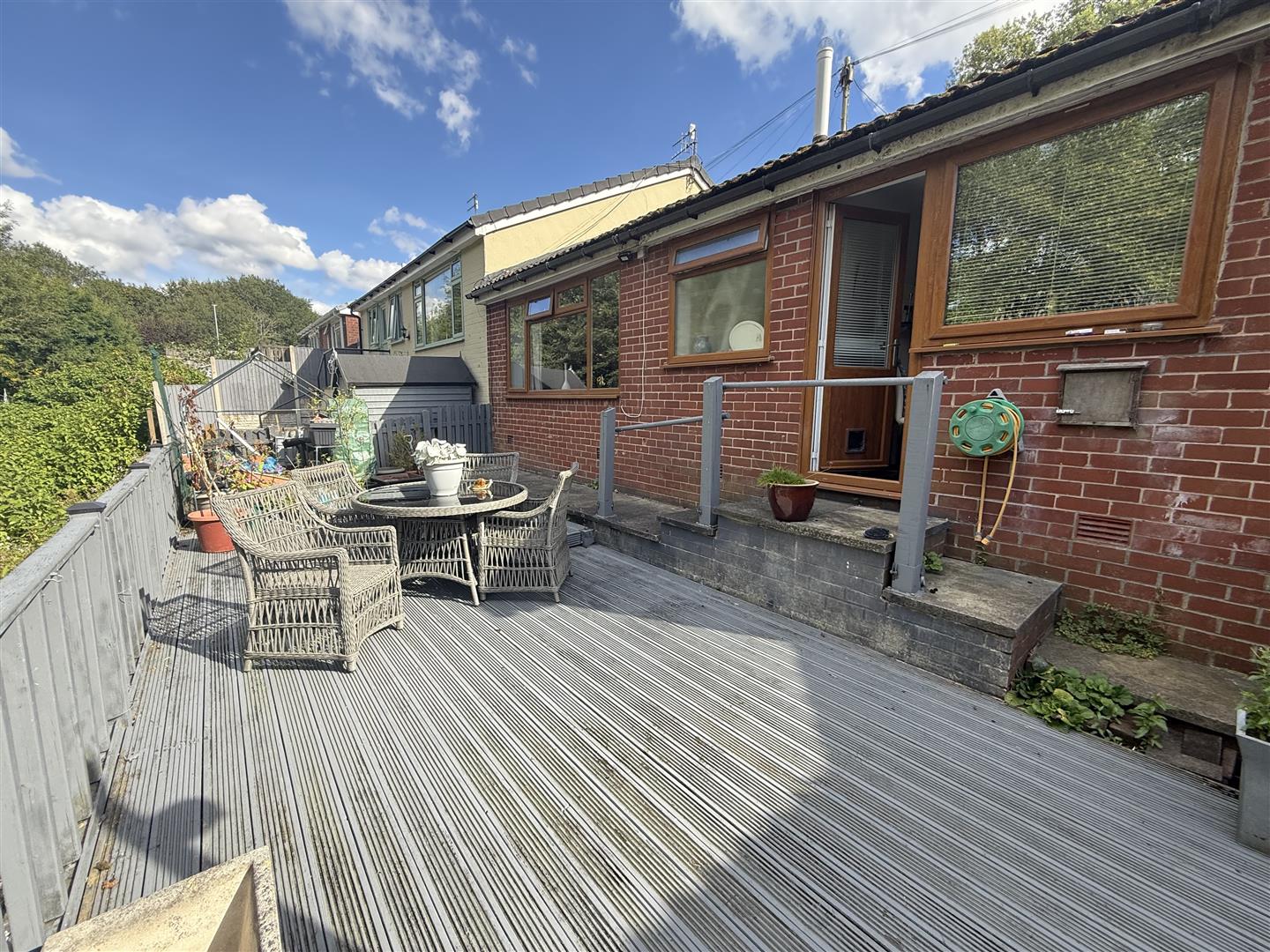 Front garden. Rear garden with a decked patio area overlooking the stream. Garage in a block over the road.