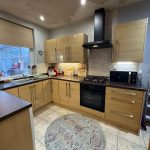 Single drainer, one and a half bowl, stainless steel, sink unit. Gas hob, electric oven and extractor. A range of wall and base units with worktops.