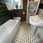 Three white piece suite, shower over the bath, shower screen, tiling.