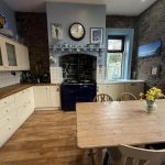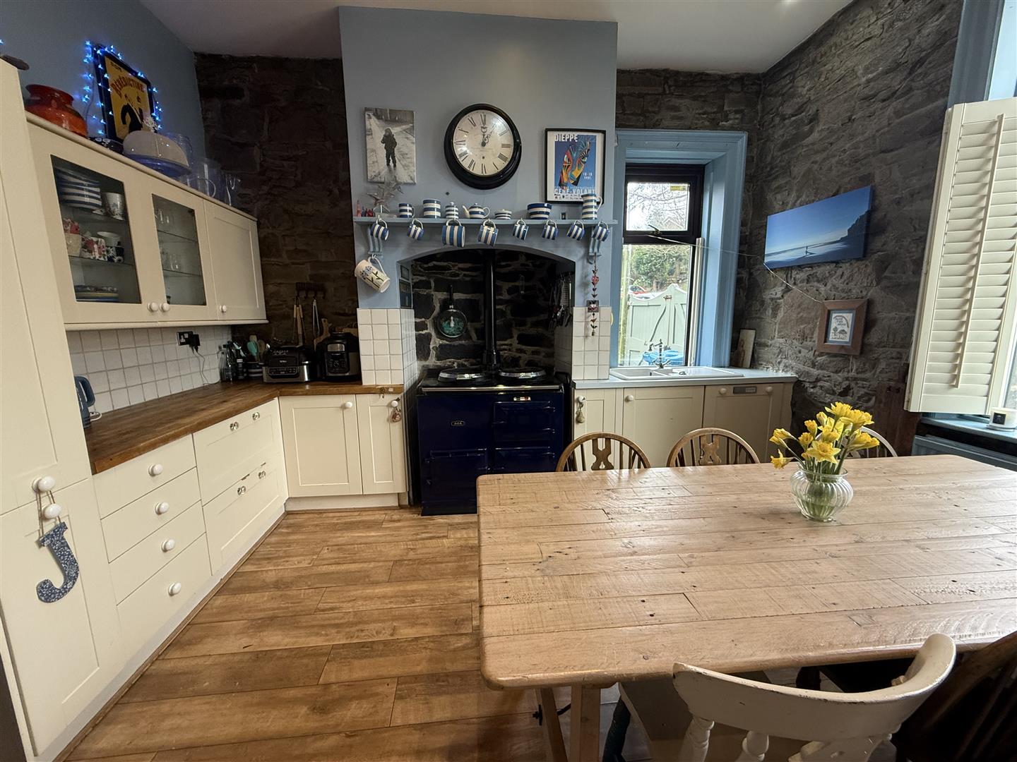 One and half bowl sink unit. Aga cooker. Fitted wall and base units with worktops.