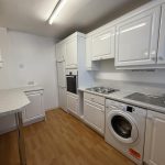 Single drainer, stainless steel, sink unit. Electric hob and oven. A range of wall and base units, splash back tiling. Fridge, freezer and washing machine included.