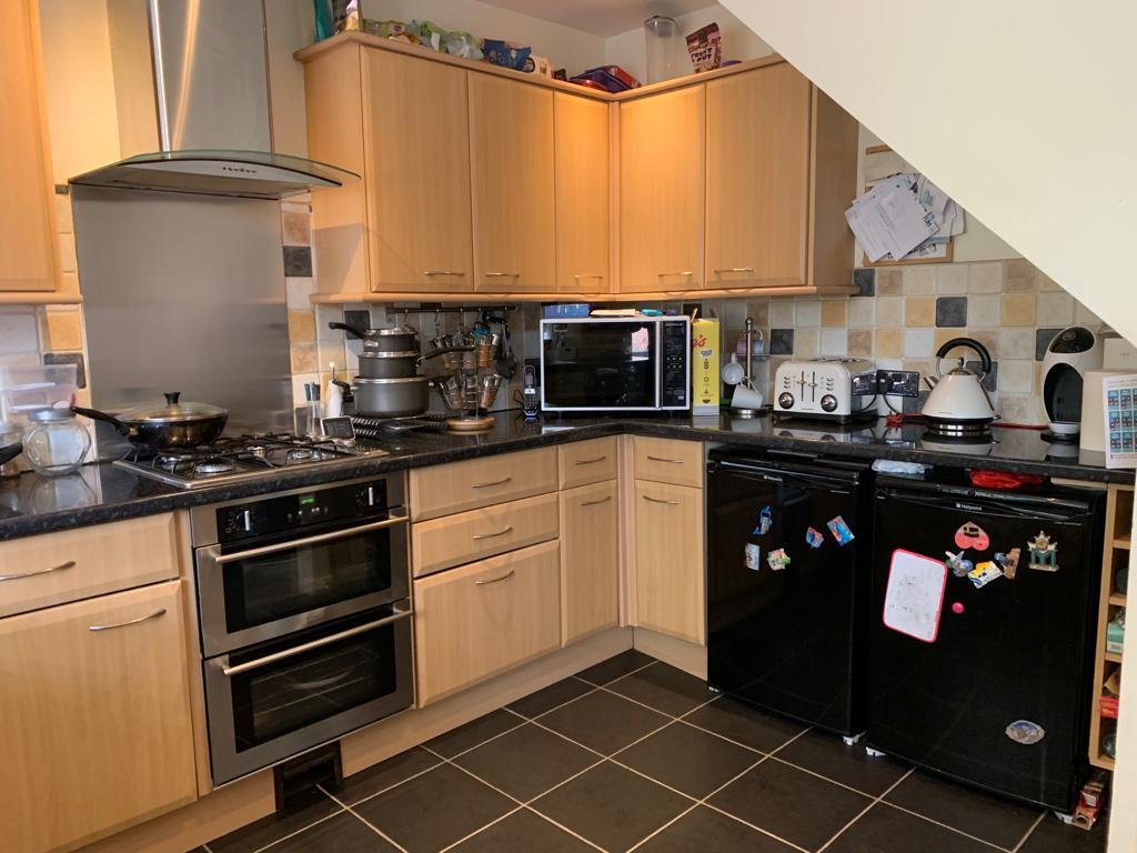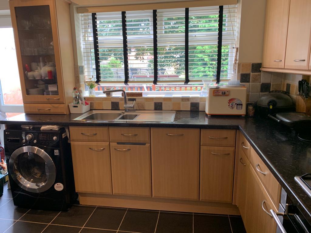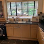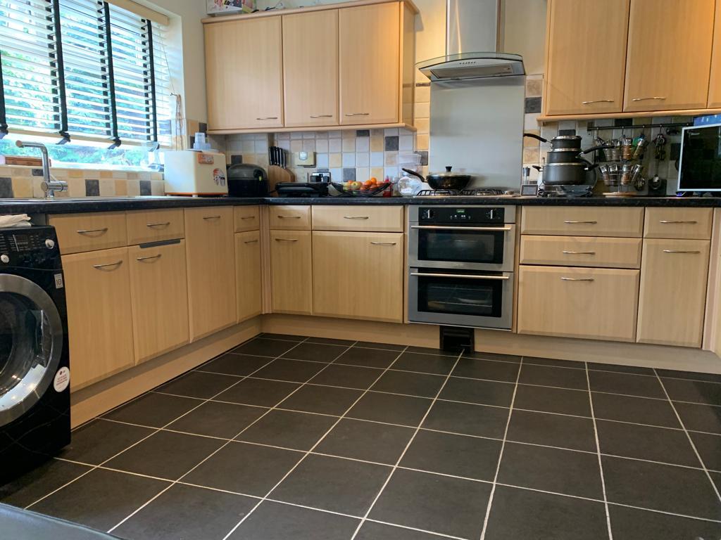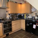 Single drainer one and a half bowl sink unit. Gas hob, electric oven, grill and canopy extractor. A range of wall and base units with worktops and splash back tiling.