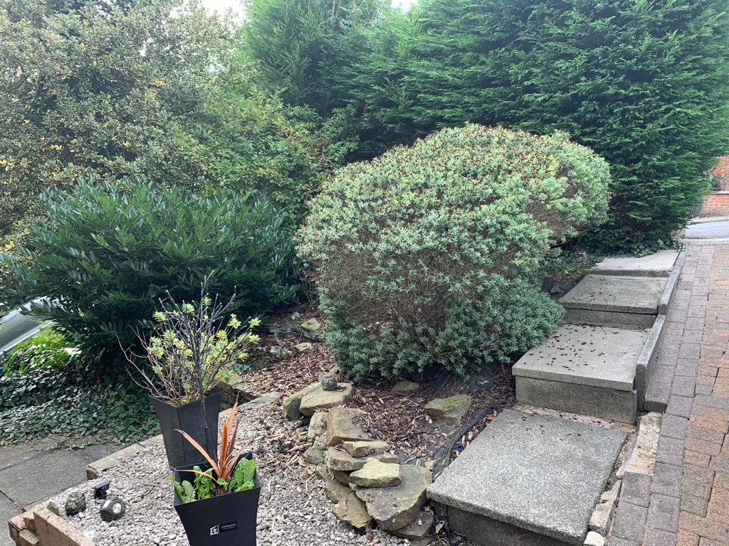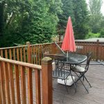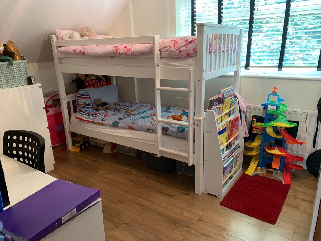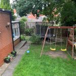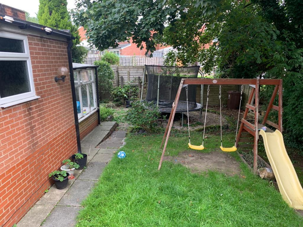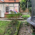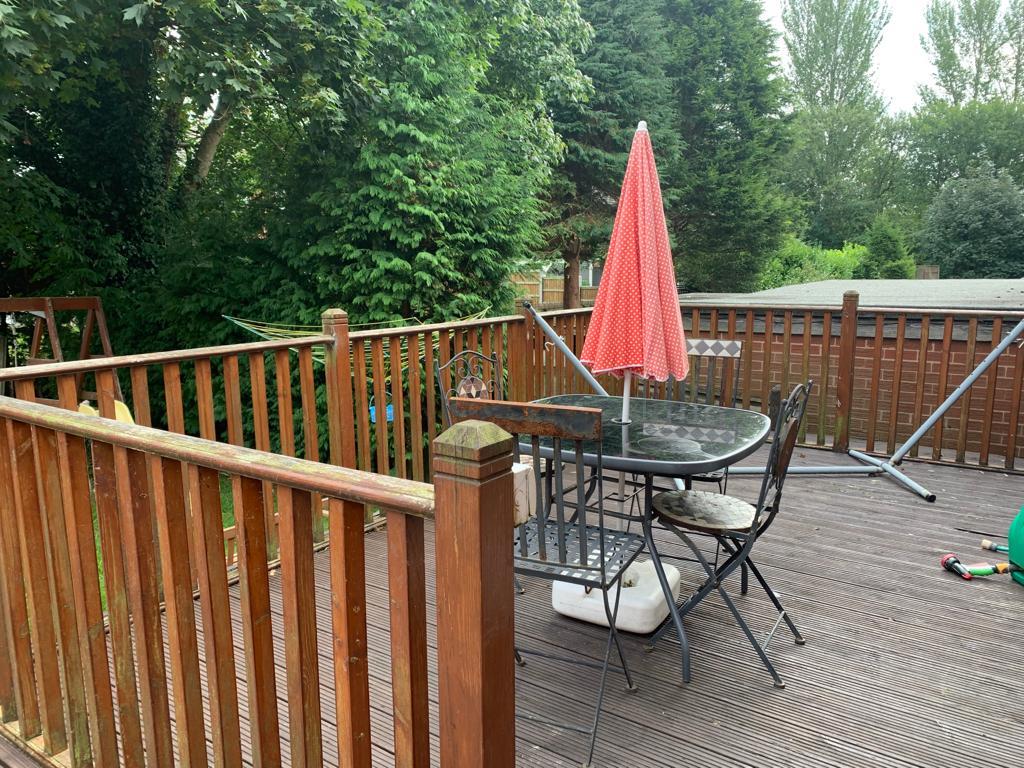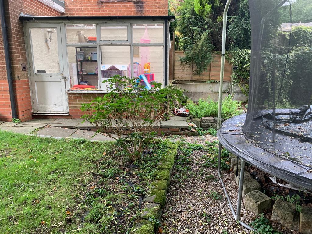 Garden at the front, driveway to the side leading to the garage. There is a private rear garden with decked patio area and a children playroom.