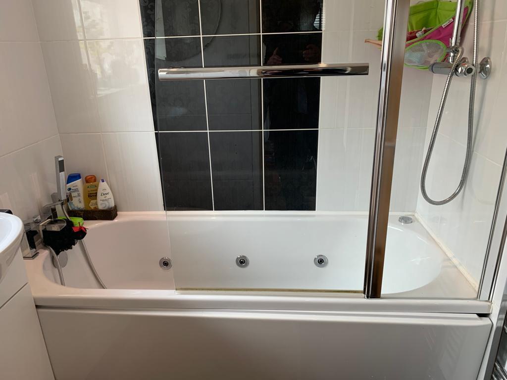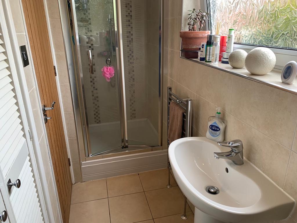 Three piece white suite, shower and shower screen, fully tiled walls and floor.