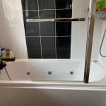 Shower cubicle, two piece white suite, fully tiled walls and floor.