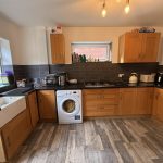 Sink unit. Gas hob, electric oven and grill. A range of wall and base units with worktops and splash back tiling.